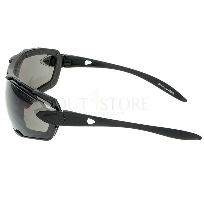 SwissEye Detection - Olive: Polycarbonate lens with antifog/antiscratch coating, 100% UVA, UVB, and UVC protection. Temples with inclination adjustment. EN 12312-1, ANSI Z87.1, EN 166 standards.