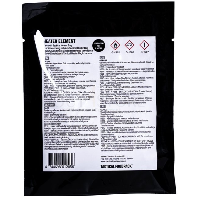 - Place the Tactical Foodpack dish in the package, with the bottom against the heater element.