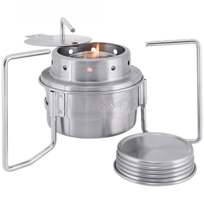 Spirit stove Tatonka Burner Set - small pack spirit stove with compact burner, integrated flame adjuster, and four-part stand. Burner (Ø 7,5 x 5,5 cm, 95 g), Flame adjuster (Ø 7,65 x 2,5 cm, 30 g), Stand Alcohol Burner (7,5 x 3 cm, 85 g). Volume: 120 ml,