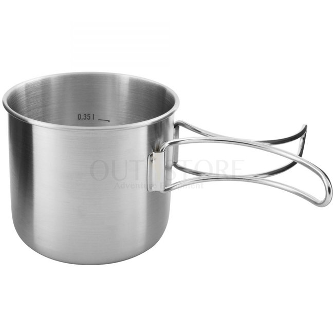 The small stainless steel set is a clever minimum equipment for trekking. The stainless steel mug and the 4 cm deep stainless steel lid have folding handles. The lid can also be used as a pan or bowl.