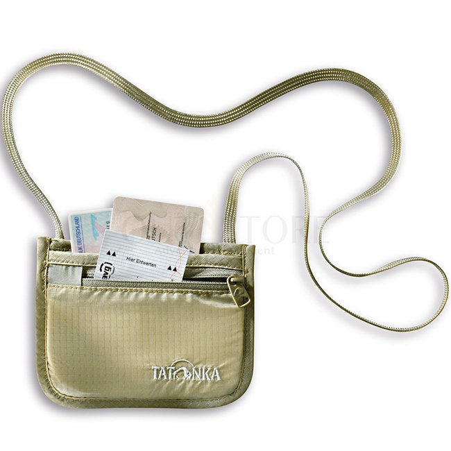 Small Neck Pouch Tatonka ID Pocket for your essentials on-the-go. Features hook-and-loop and zip pockets, neck string, soft material, and fits ID cards. Compact at 10x13cm, lightweight at 20g.