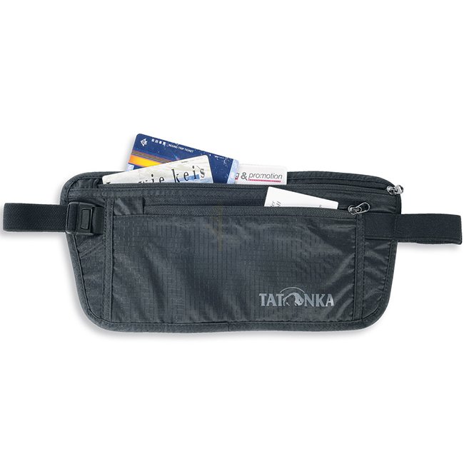 Tatonka Skin Moneybelt Int - Black: Flat money belt designed for hidden wearing under clothing with quick fastener, two zipped pockets, fits EU passport, dimensions 14 x 28 cm, weight 45 g. Made of soft material and durable 210T Nylon Ripstop.