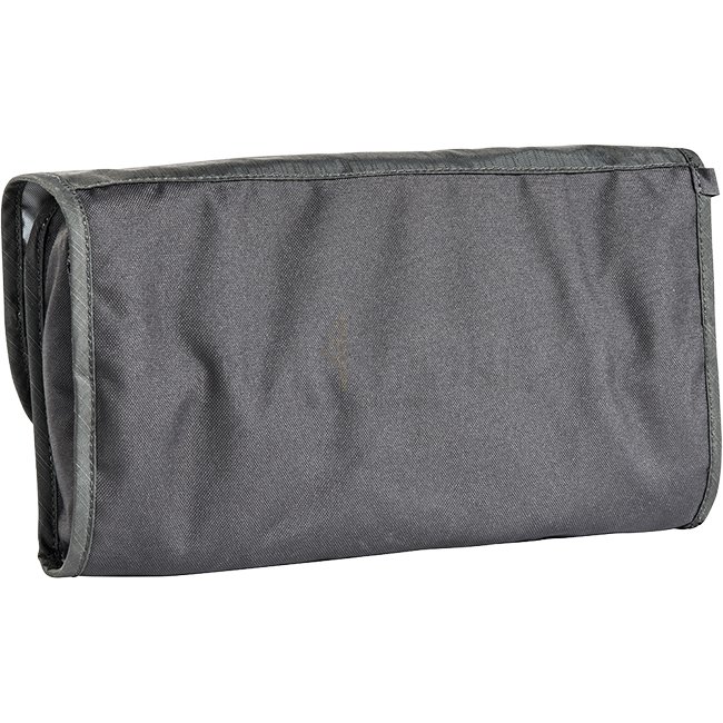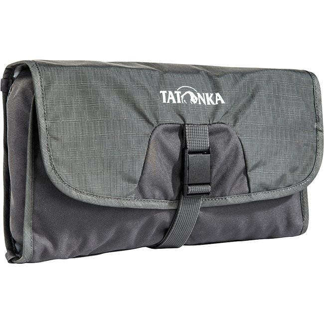 Foldable toiletries bag for hanging: Tatonka Small Travelcare - Titan Grey. Has 2 large compartments, 3 pockets, mirror, suspension hook, and compact design.
