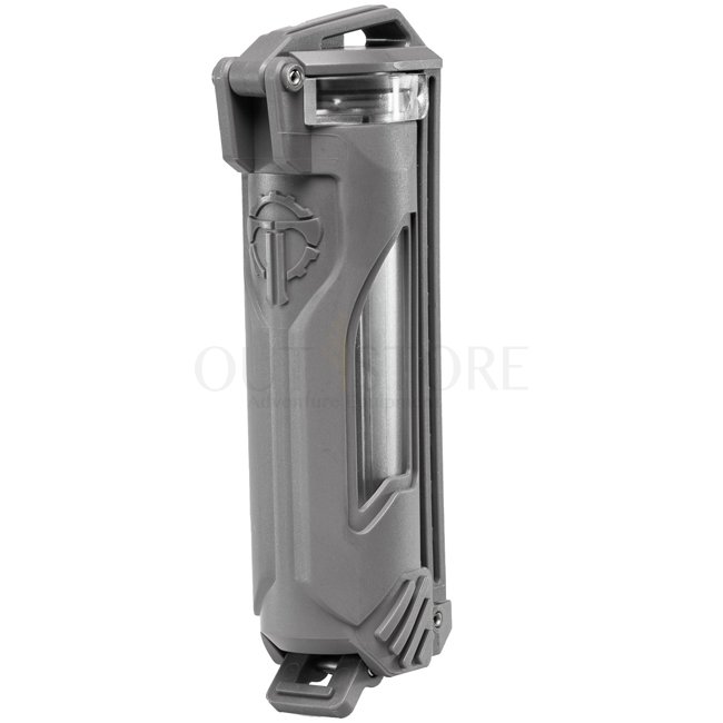 THYRM CellVault-18 Battery Storage - Grey. Holds 1x 18650 or 2x 18350 rechargeable batteries. Waterproof o-ring seal rated to IPX7 at 2 meters for 30+ minutes. Folding metal latch for simple installation. Silicone foam shock absorber/noise silencer. Clear