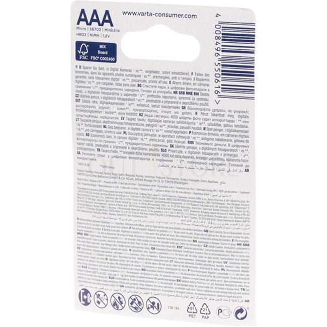 Varta AAA Rechargable batteries, 800mAh capacity, pack of 4 pieces. Reliable power source for various devices.