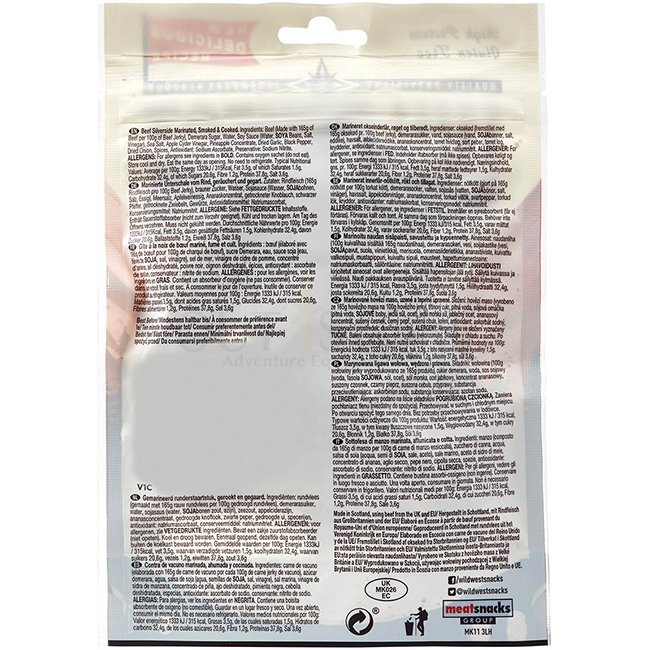Marinated beef silverside, smoked and cooked Ingredients: Beef (made with 165g of Beef per 100g of Beef Jerky), demerara sugar, water, soy sauce (water, soya beans, salt, vinegar), sea salt, apple cyder vinegar, pineapple concentrate, dried garlic, black pepper, dried onion, spices, antioxidant: sodium ascorbate, preservative: sodium nitrite Allergens: soya Nutritional values per 100 g: energy in kJ/kcal: 1333/315 fat 3,5 g, of which saturates 1,5 g carbohydrate 32,4 g, of which sugars 20,6 g fibre 1,2 g protein 37,8 g salt 3,6 g Content: 70 g