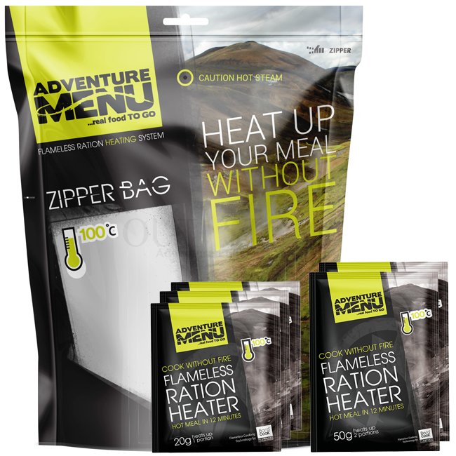 Profitez du plus grand confort lors de vos déplacements. À partir de maintenant, vous n'avez plus à transporter de cuisinière ou de vaisselle partout. Nous présentons le CHAUFFAGE SANS FLAMME pour les repas Adventure Menu. C'est léger, c'est rapide, c'est révolutionnaire. Le Heater peut réchauffer un repas en seulement 12 minutes. Il ne peut être utilisé qu'une seule fois et est 100% biodégradable.