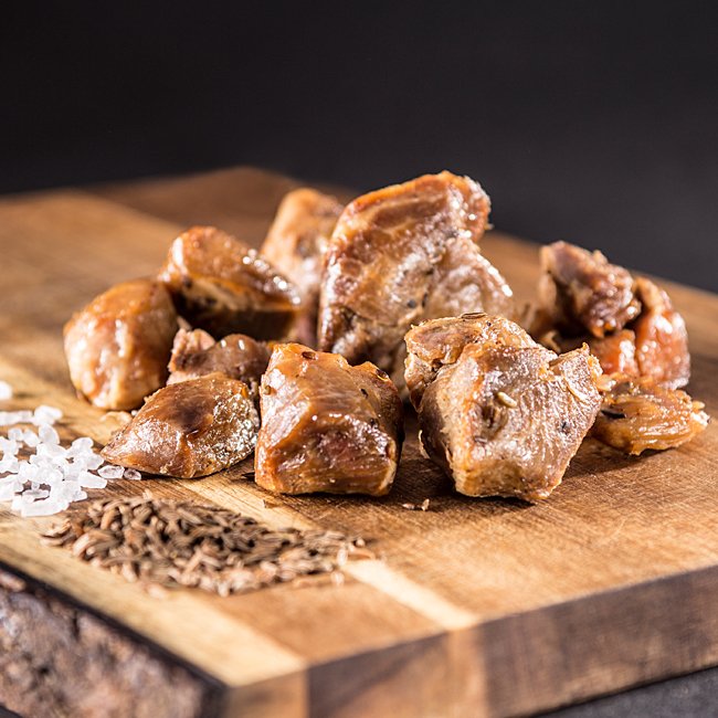 Vous n'avez pas besoin d'extras, vous n'avez pas besoin de ballast supplémentaire inutile. Vous n'avez besoin que de la viande ! Morceaux d'épaule de porc cuits à la vapeur et cuits à la vapeur au cumin. En raison de sa teneur plus élevée en matières grasses, la viande est juteuse et savoureuse, et même après avoir perdu un tiers de son poids au cours du processus de cuisson, elle n'est ni sèche ni filandreuse. Son faible poids et sa haute valeur nutritionnelle en font la solution idéale pour les randonnées, les voyages à vélo et à peu près partout où vous voyagez léger.