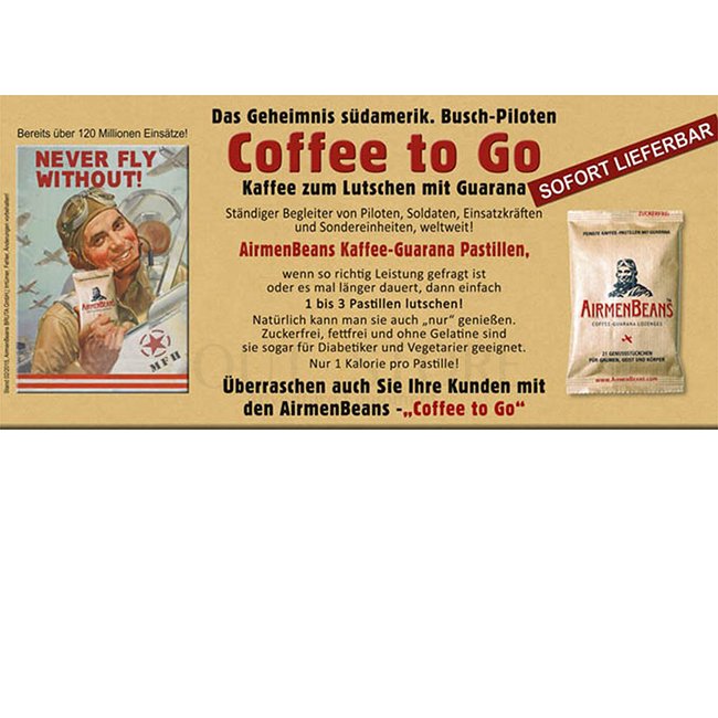 "Coffee to suck", AirmenBeans sont sans sucre, sans gras et sans gélatine, donc adapté pour les diabétiques et végétariens., valeur nutritive par 100 g: energie kJ / kcal: 604/143, protéines: 0, glucides: 40,8 g, dont sucres 0 g / 0,6 g de matières grasses, caféine provenant d'extrait de guarana: 250 mg, la caféine du café extrait 175 mg, 1 BE = 30 pastilles, une pastille contient une calories, sans sucre,