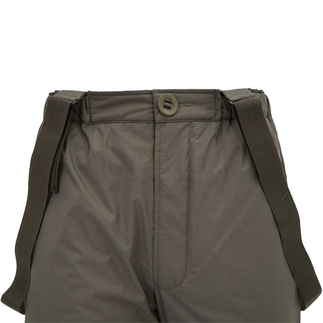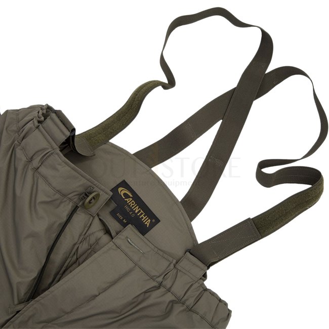 Pantalons Carinthia HIG 4.0 haute performance en olive - taille 2XL. Comprend des accessoires protégés, une zone de genoux renforcée, une isolation G-LOFT®, un tissu Gore Windstopper®, des bretelles ajustables et de multiples poches. Idéal pour les aventu