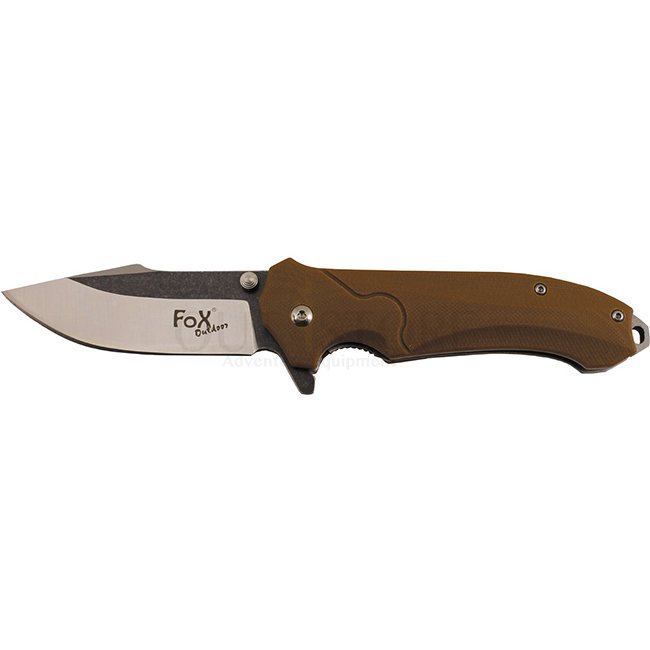 Couteau pliant FoxOutdoor de haute qualité 2 G10 avec poignée en couleur Coyote. Caractéristiques : lame noircie à biseau droit, bouton pouce et ouverture à flipper. Fabriqué en acier durable 8Cr13MoV avec verrouillage par linerlock et poignée en métal er