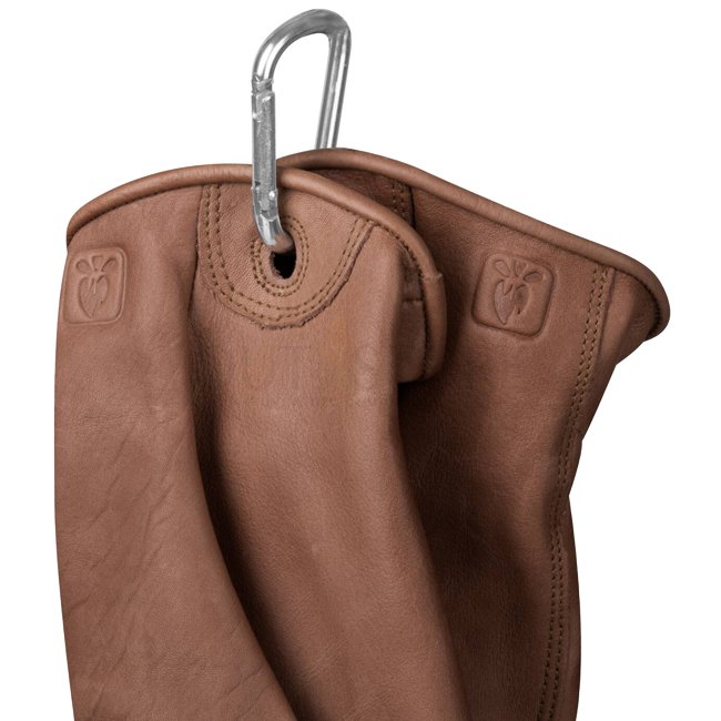 Gants en bois faits de cuir de vachette durable pour une bonne prise en main. Coupes confortables pour une utilisation prolongée avec manchette élastique. Peuvent être attachés à la ceinture ou au sac avec une manchette renforcée et un mousqueton. Conçus