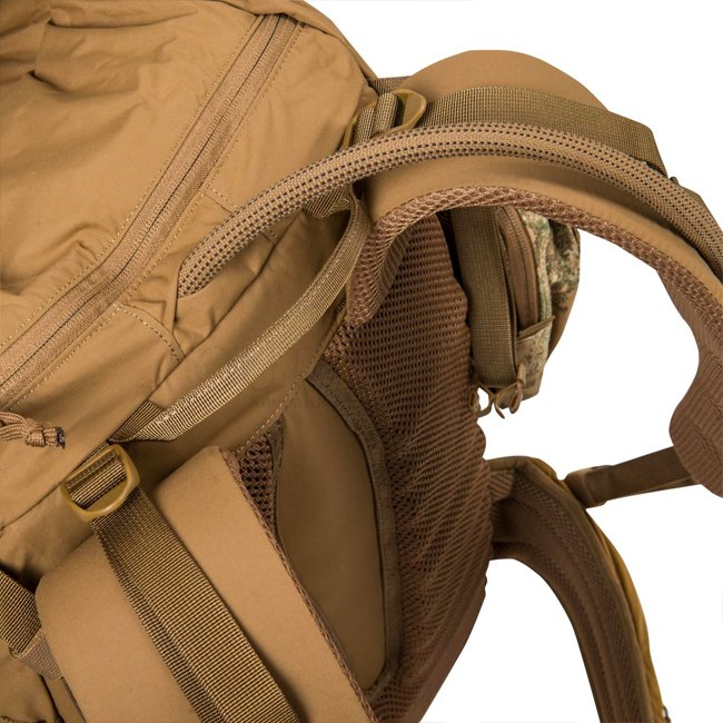 Sac à dos Helikon-Tex Summit de couleur olive, fabriqué en tissu Cordura léger avec des fermetures éclair YKK et des boucles Woojin. Comporte des bretelles profilées, une ceinture de hanches, un rolltop, des accès frontal et latéral, des poches en maille,