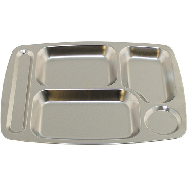 Plateau de cantine en acier inoxydable, portable et pratique, avec 3 compartiments pour la nourriture, un compartiment pour les boissons et un compartiment pour les couverts. Design empilable avec des dimensions d'environ 36 x 27 x 2,5 cm et pesant enviro