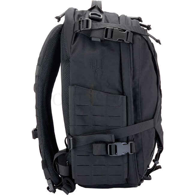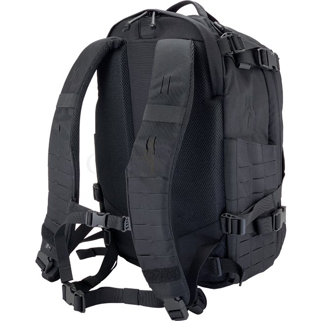 Sac à dos FastTrack spacieux, compact et tactique en noir. Fabriqué en nylon Cordura 500D avec des fermetures éclair YKK et du matériel Woojin. Dimensions : 460 x 320 x 250 mm (HWD). Poids : 2130 g.