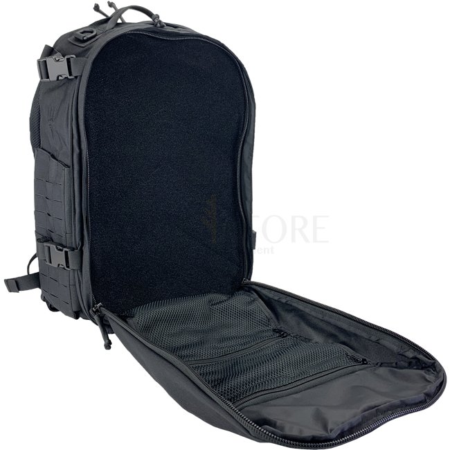 Le compartiment principal est doublé d'un matériau à boucle souple des deux côtés pour attacher des pochettes et des accessoires à système de crochet et de boucle pour une modularité maximale. Le compartiment de rangement secondaire est d'un côté recouvert du même matériau de boucle et de l'autre, deux pochettes en filet à fermeture à glissière installées fixes peut contenir des objets plats.