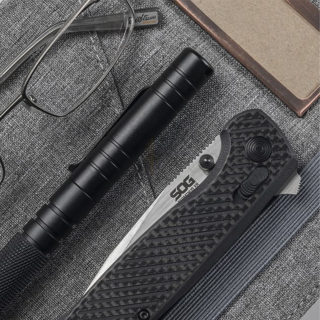 Le SOG Terminus XR est un couteau de poche EDC léger avec une robuste lame en CPM S35VN, un élégant manche en G10 et en fibre de carbone, et un design compact parfait pour un usage quotidien. Il ne pèse que 91g et mesure 1831mm de longueur totale, avec un