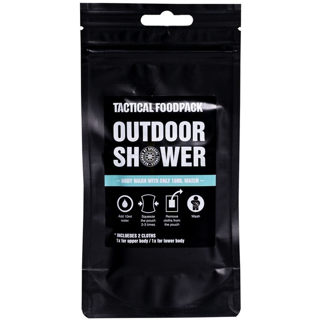 Douche extérieure Tactical Foodpack : solution innovante pour se laver en extérieur. Parfaite pour les situations où l'eau ou les possibilités de lavage manquent. Amie de la peau, non sensibilisante, sans conservateurs. Contient du panthénol pour nettoyer