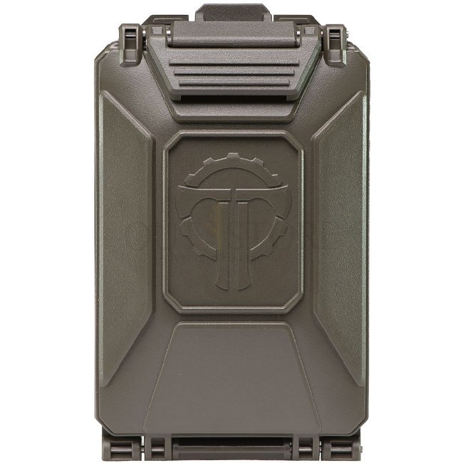 THYRM CellVault-5M Rangement modulaire pour batteries - Olive, construction en polymère étanche et durable, avec inserts modulaires pour différentes tailles de batteries. Loquet verrouillable, sangles d'attache MOLLE, et taille compacte. Dimensions : 16,5