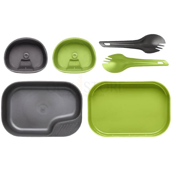 Kit de repas compact et léger pour deux personnes, comprenant une assiette avec couvercle, 2x Fold-A-Cup, 2x Wildo Spork. Sans BPA, fabriqué en Polypropylène durable et TPE. Pèse 190g, dimensions 190 x 130 x 50mm. Fabriqué en Suède.