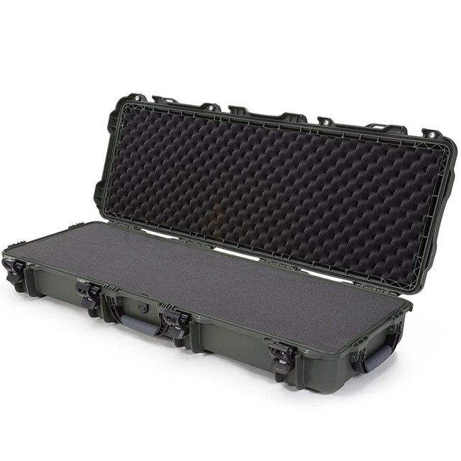 Langformatiges, robustes Schutzgehäuse aus NK-7-Resin mit PowerClaw-Verriegelungssystem, automatischem Druckausgleichsventil, Soft-Grip-Griff und Edelstahlbeschlägen. Diese Ausführung wird mit einer vorgestanzten, mehrlagigen Würfelschaum-Einlage im Boden und Deckelschaum geliefert und bietet hochwertige Polsterung sowie klare Organisation für Langwaffen, Optiken und Zubehör.